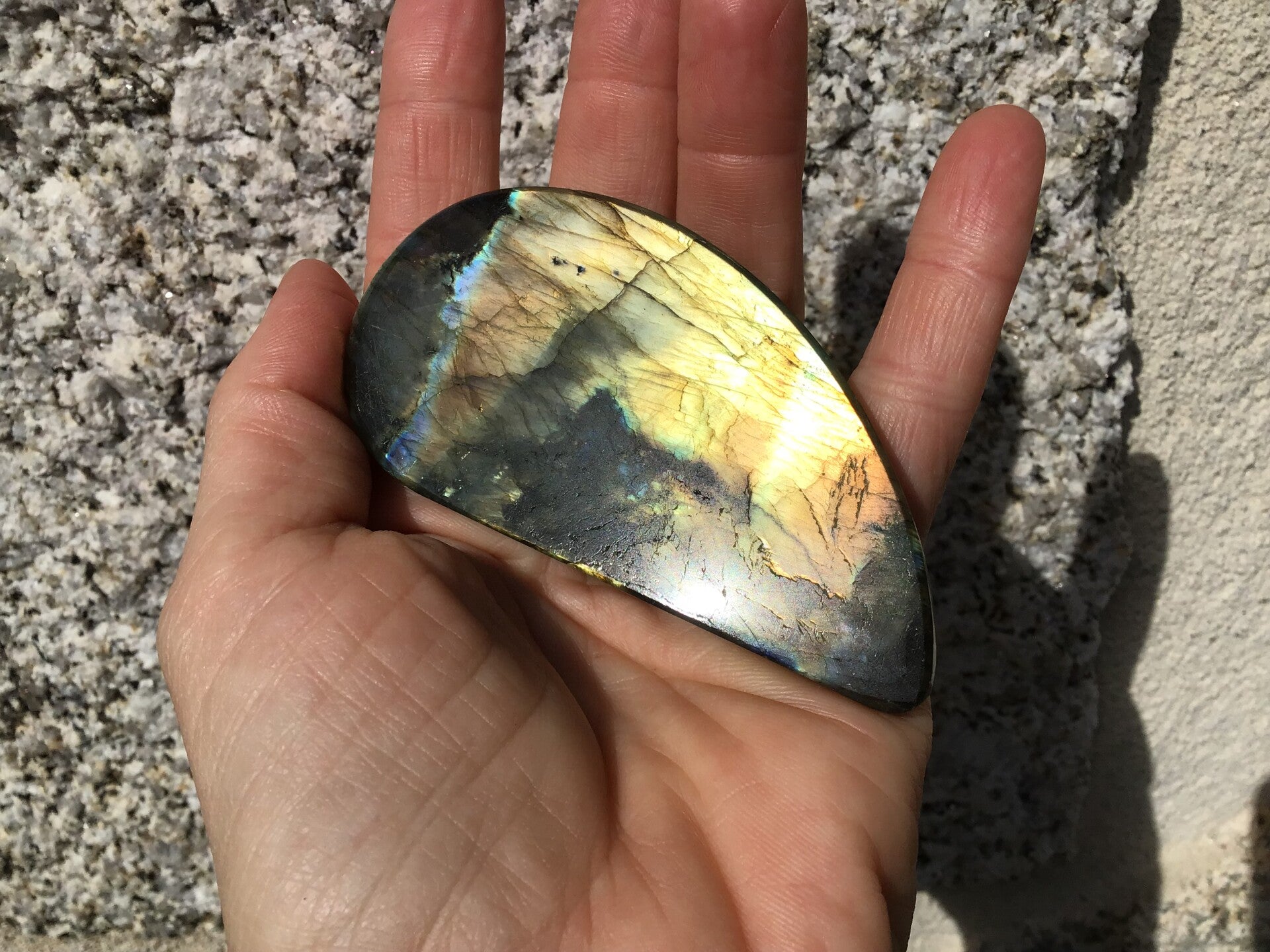 Grand cabochon free forme en labradorite jaune doré avec un peu de bleu. Superbe pièce en labradorite naturelle, idéale pour être utile en soin énergétique ou simplement magnifique en collection.