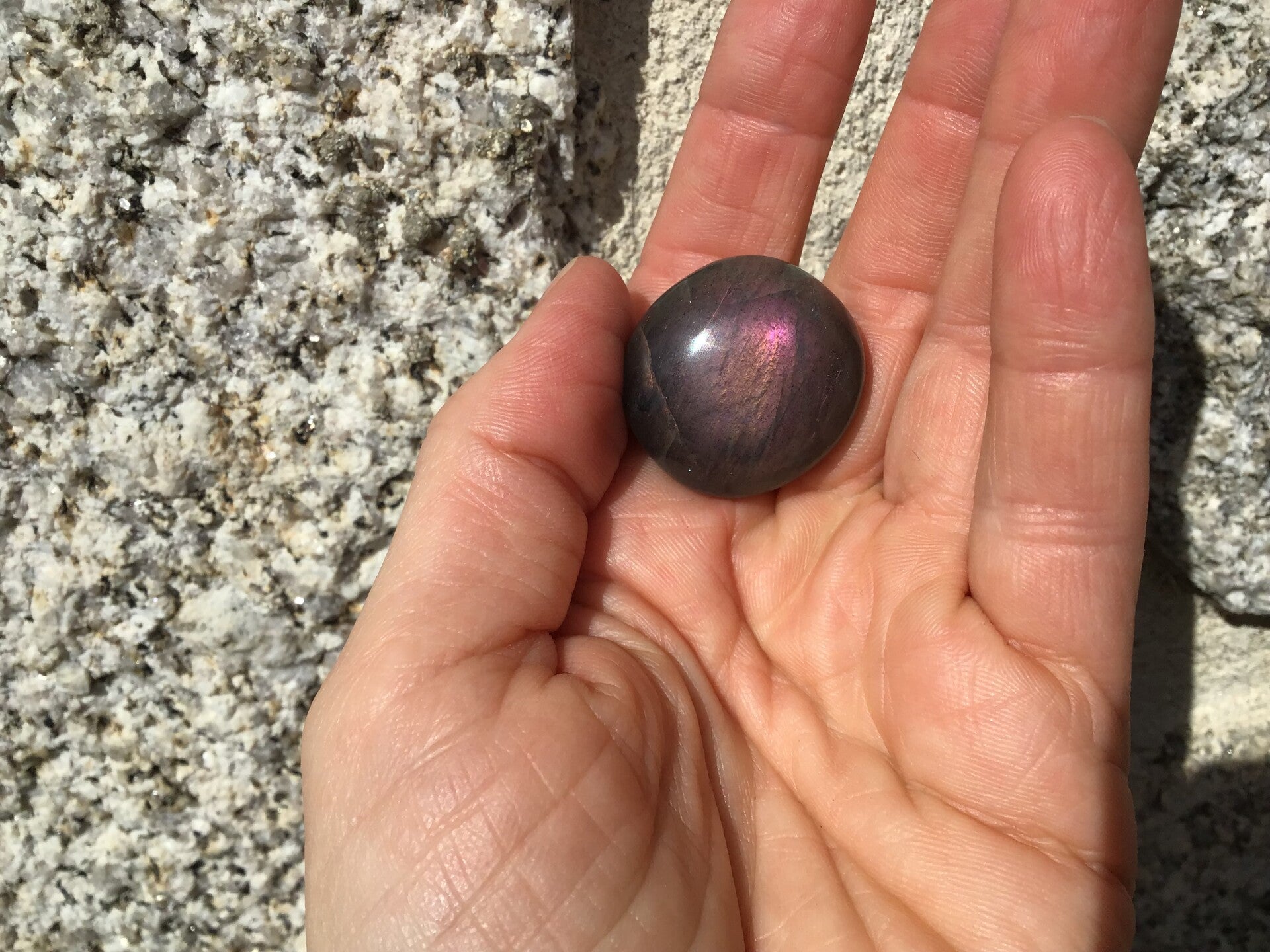 Labradorite rose et orangée naturelle de MAdagascar, petit galet rondouillé de 2,8cm et 1,7 cm d'épaisseur. Il a été taillé avec application à Madagascar.