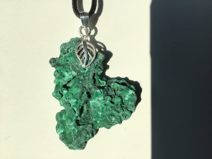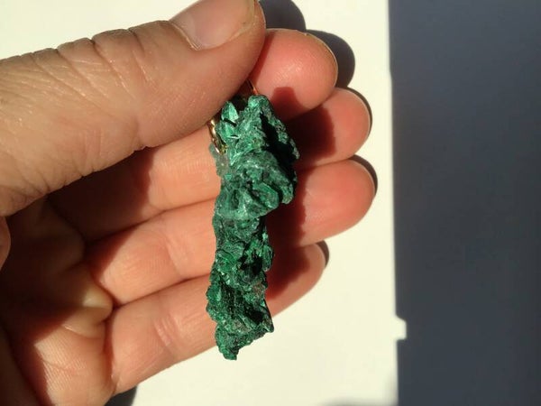 3,9 cm pour ce joli morceau de malachite fibreuse du Congo, brut, juste percé, avec bélière argent925.