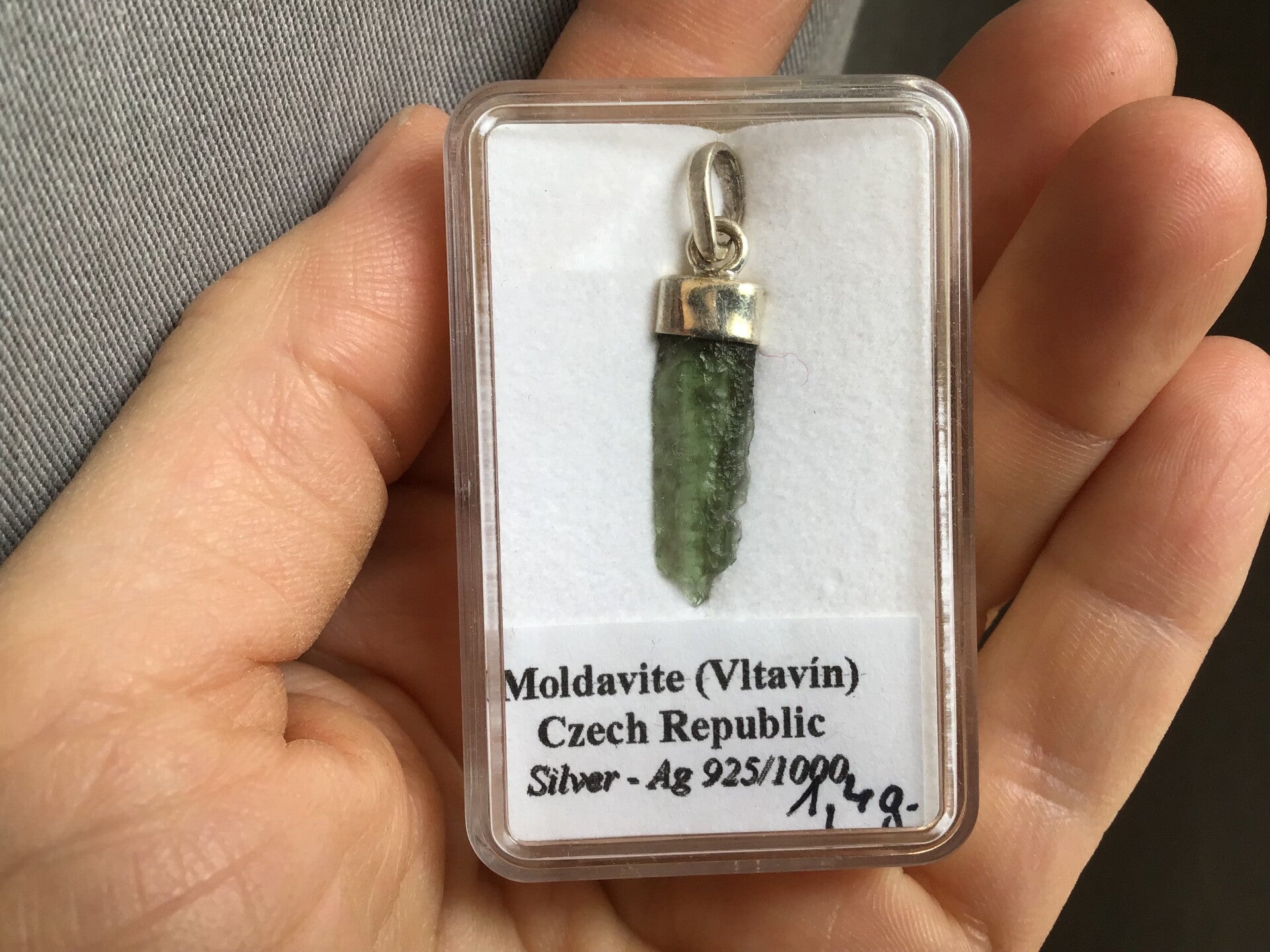 Moldavite veritable, naturelle, de 2,4 cm, achetée directement à des tchèques dans le grand salon internationnal des minéraux en Alsace.
