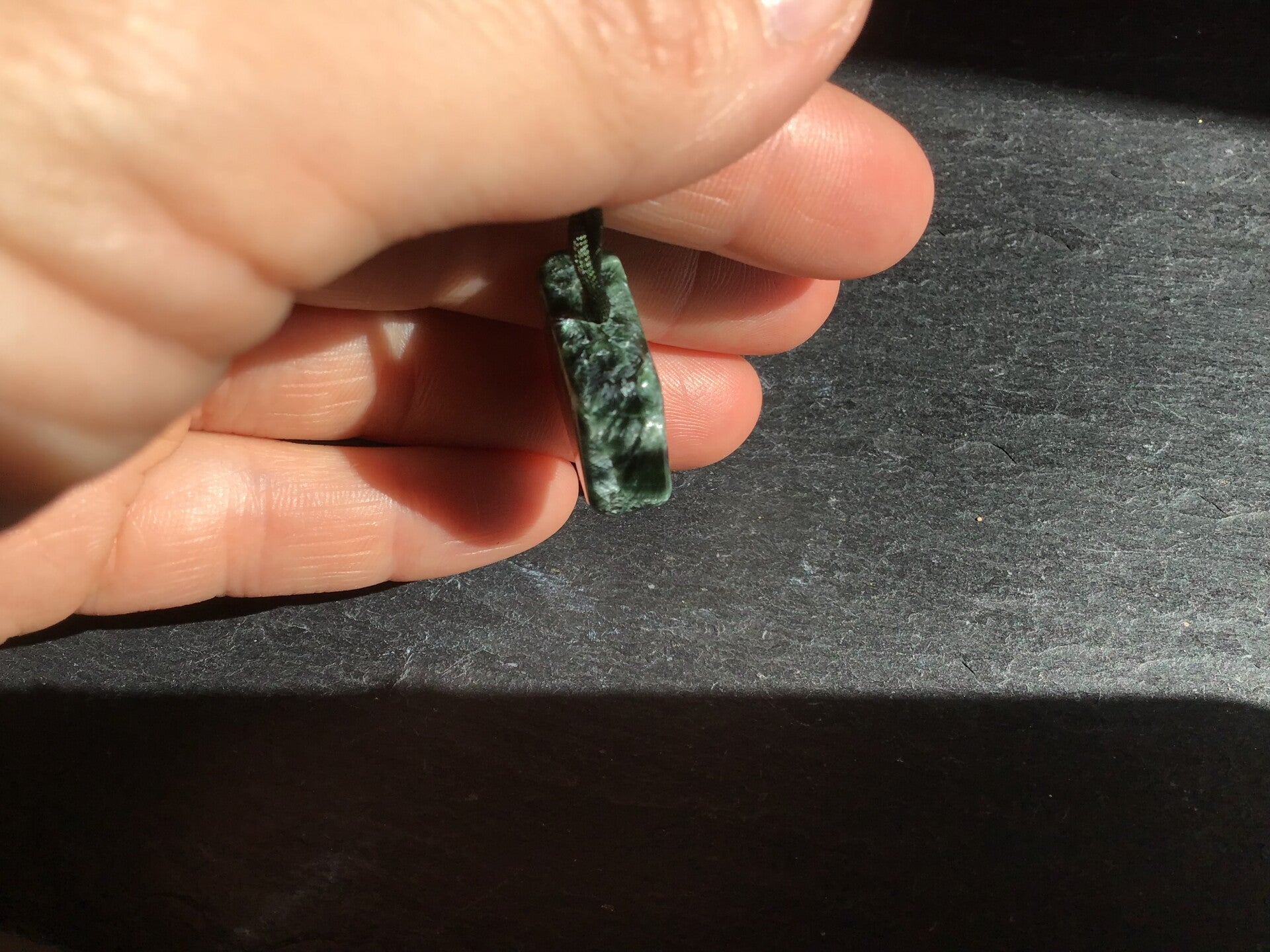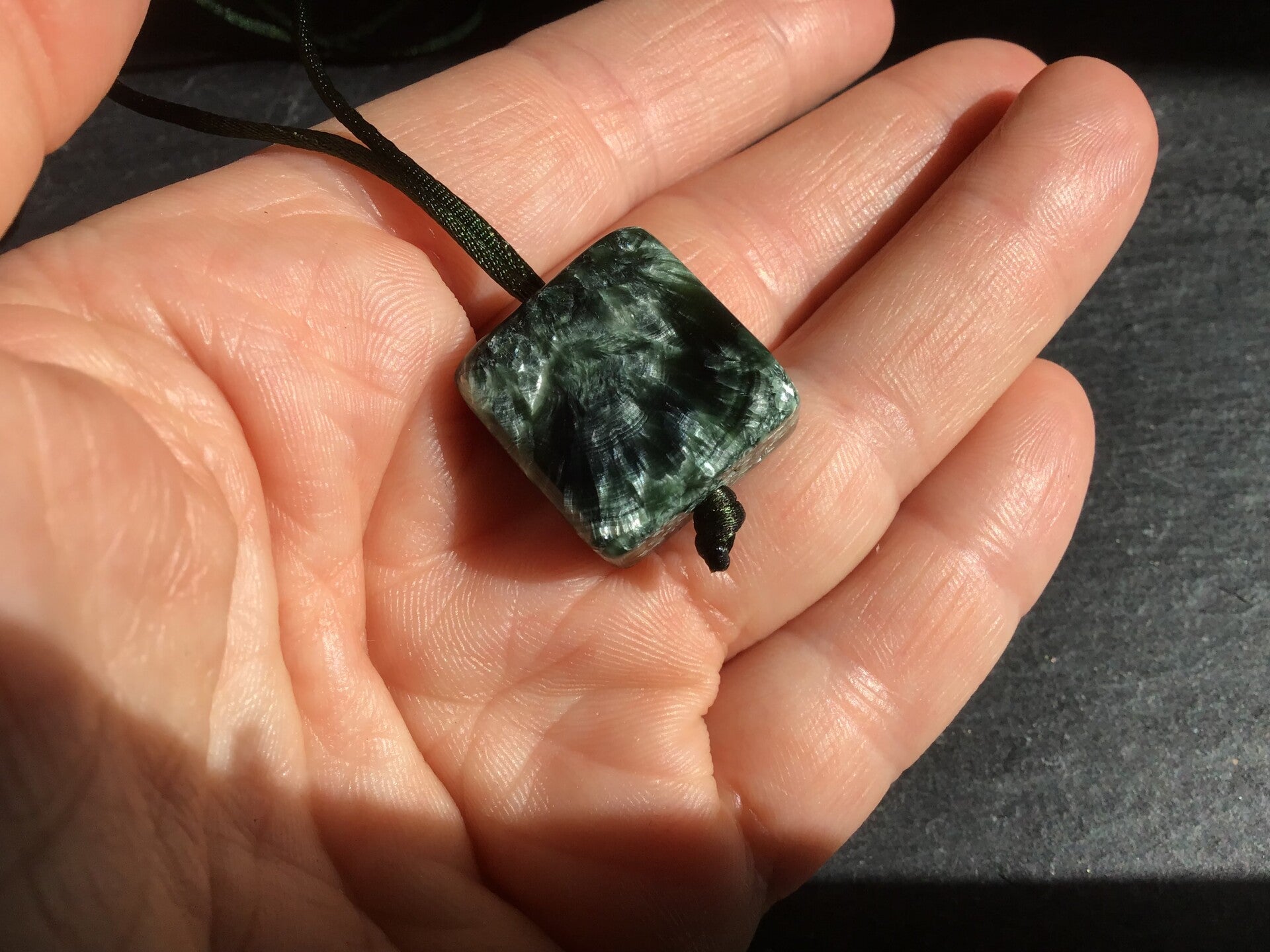 Sur cordon polyester : cube d'env 2cm sur 6mm d'épaisseur, en seraphinite naturelle, taillée en France. Vous pourrez ajuster la longueur du cordon à votre tour de passage de tête, en refaisant le petit noeud sous le cube :)