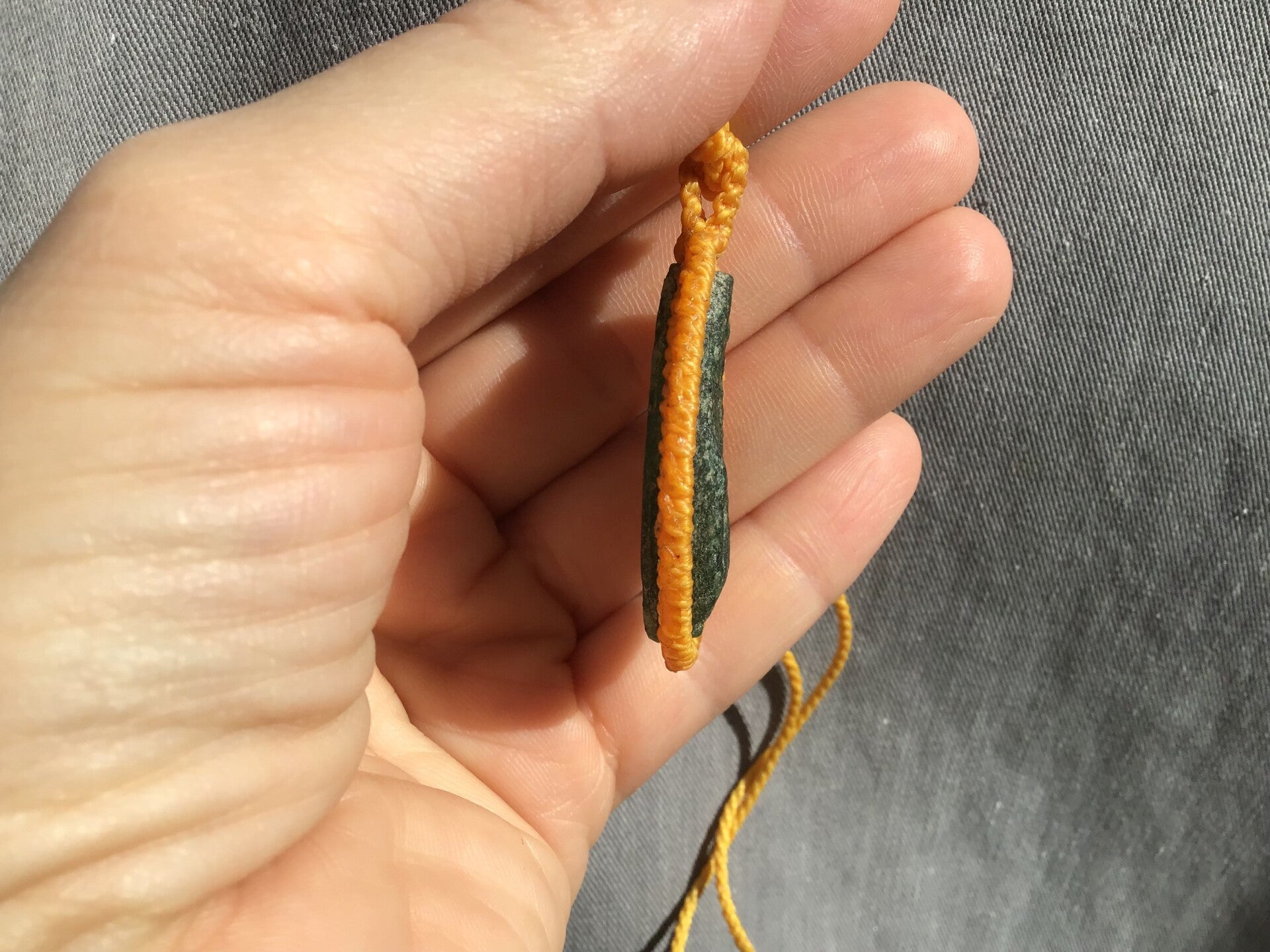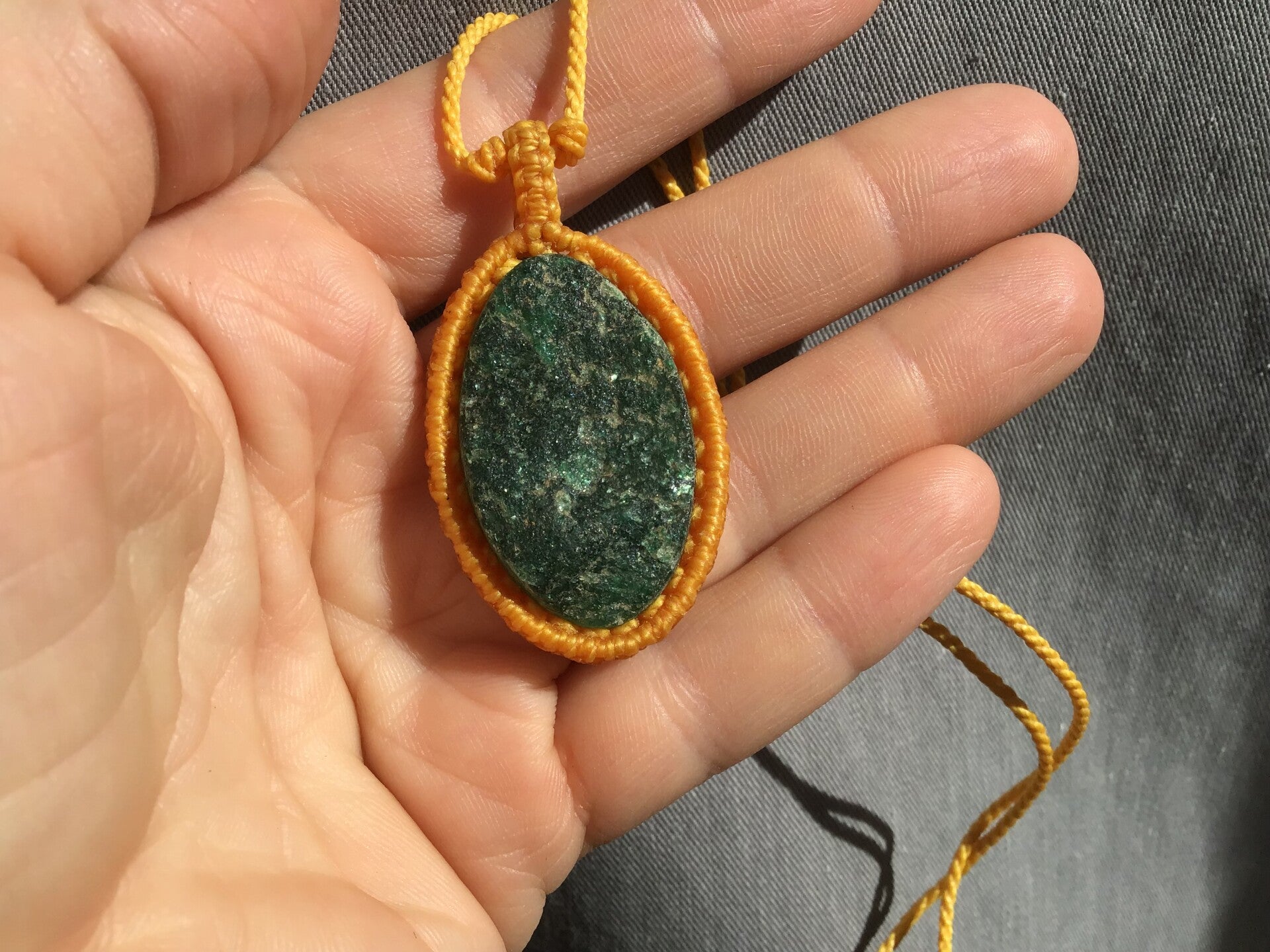 Oval de 3,3cm juste adouci au dos, en aventurine naturelle à la texture brute sur la face avant. Entourée de macramé mexicain, technique solide de sertissage où la pierre est rainurée. Pendentif unique, issu de l 'artisanat français.