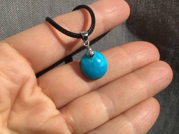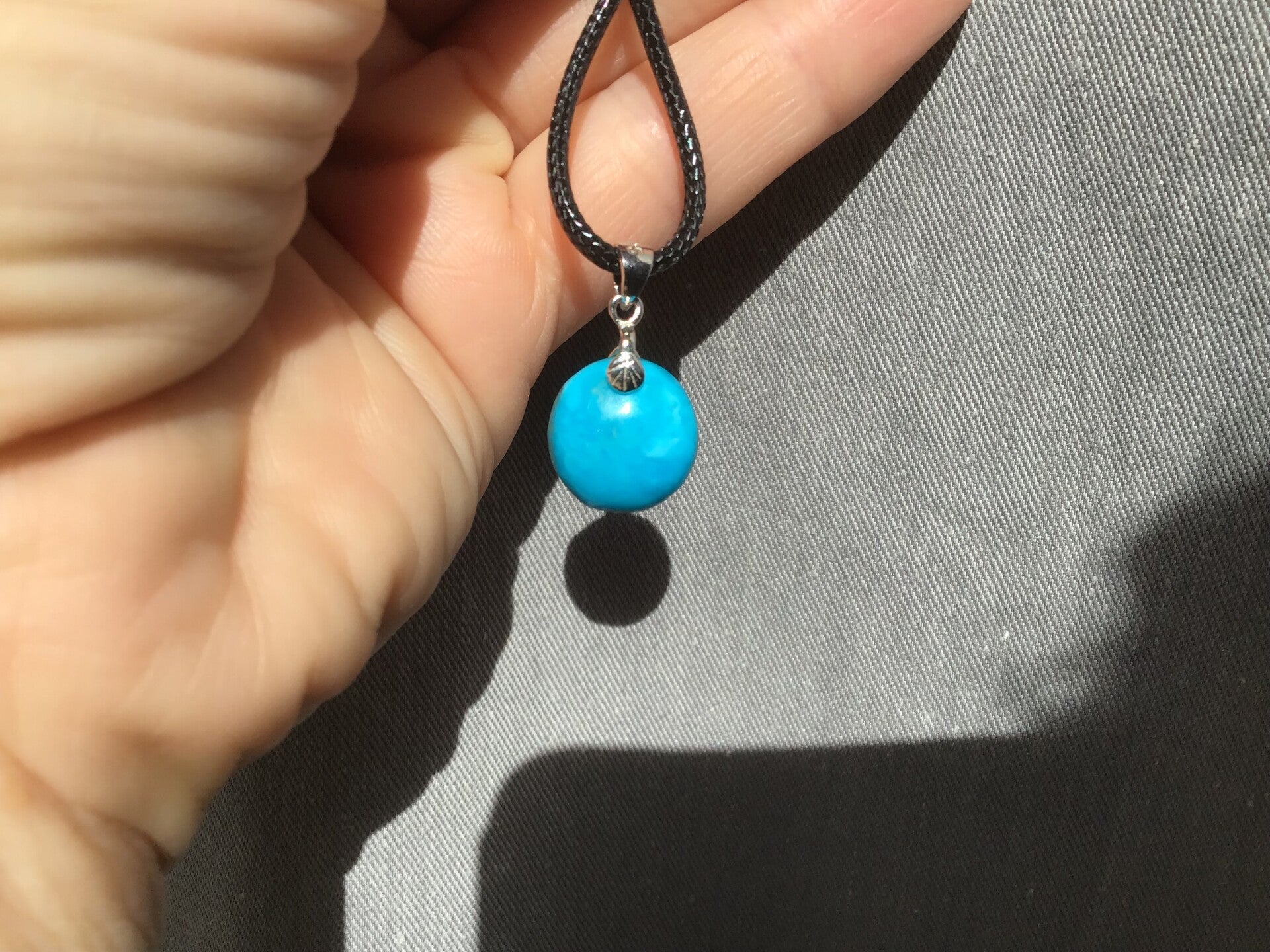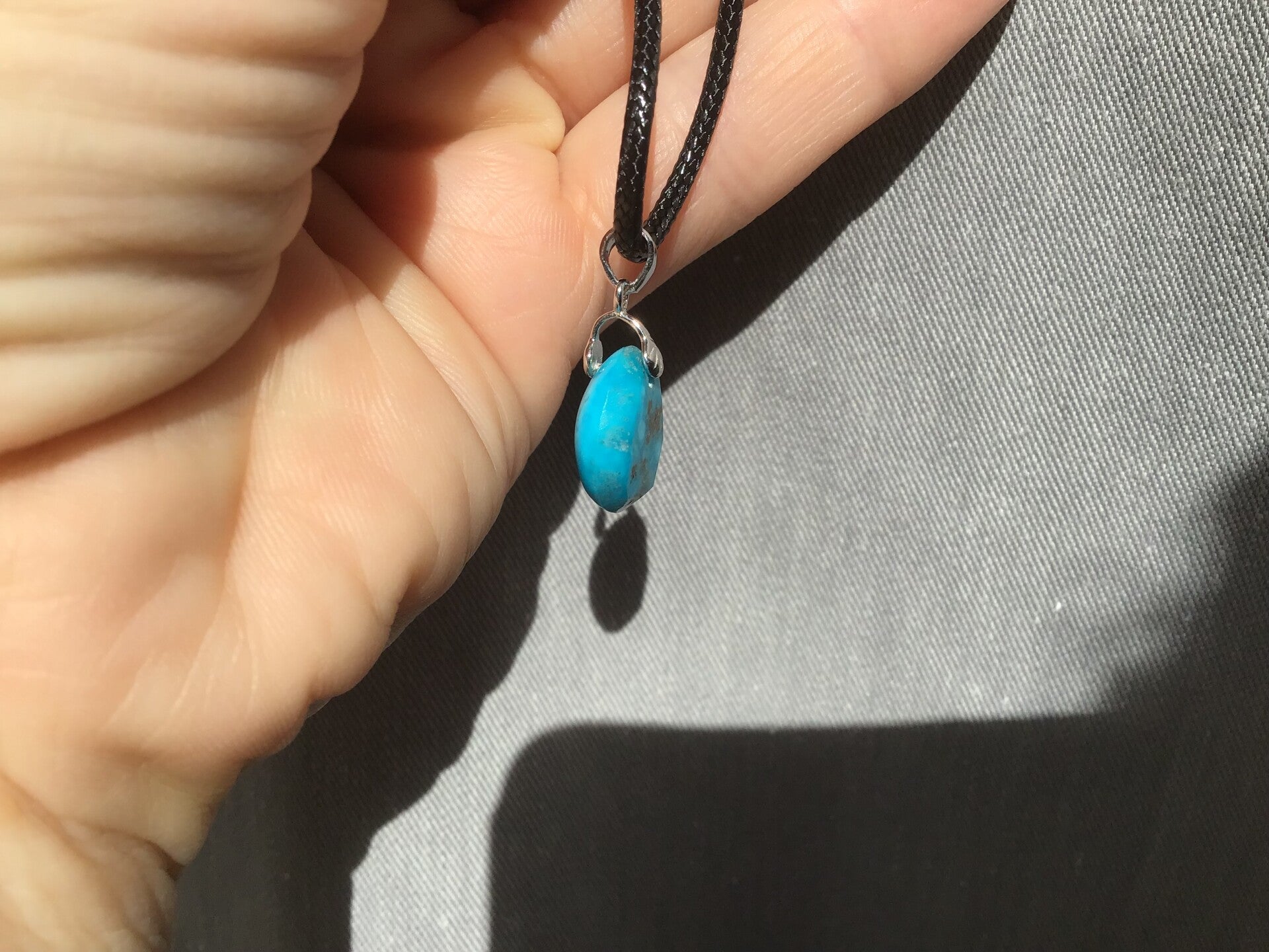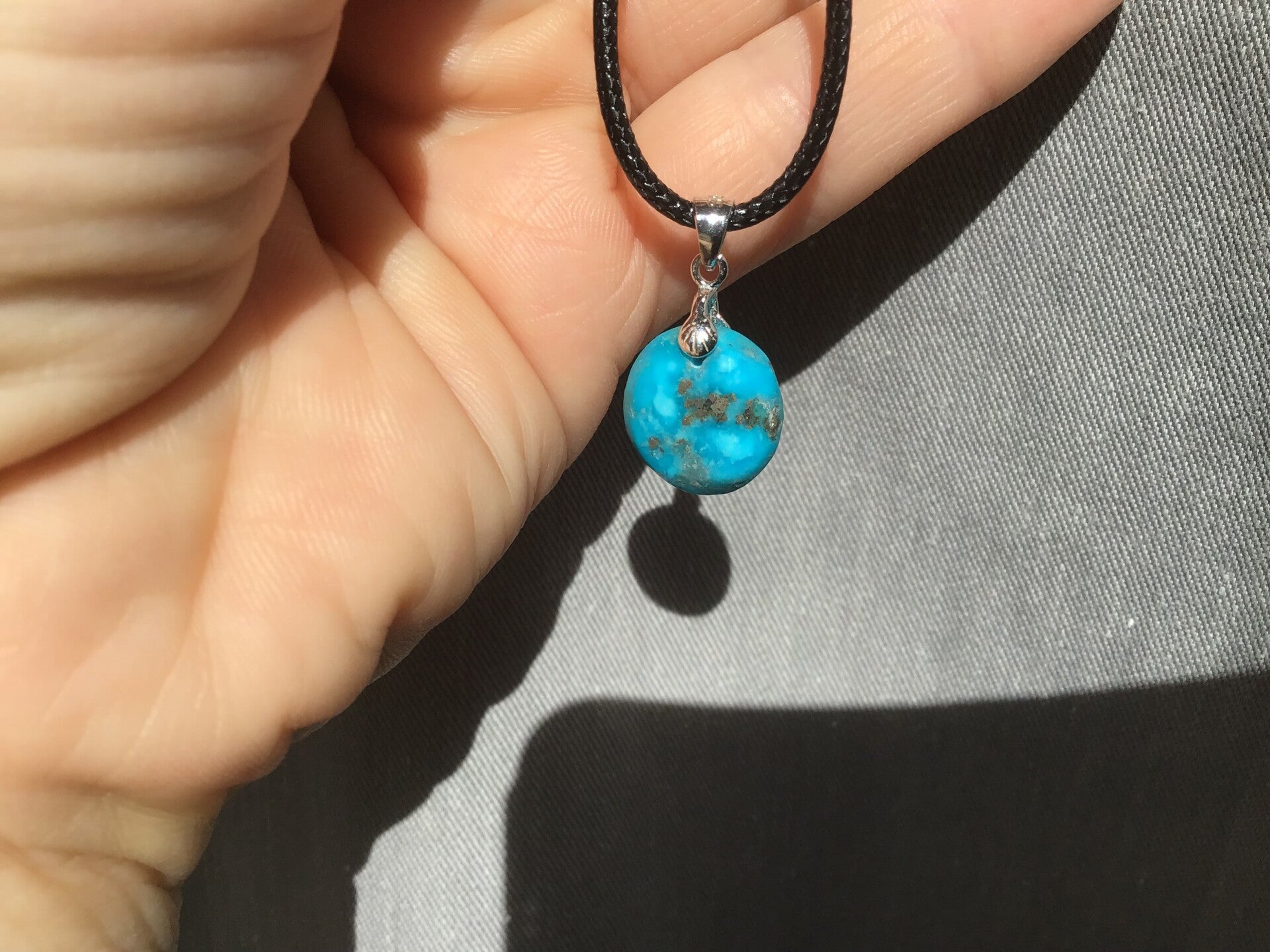Cette petite turquoise de 1,4 cm vient d'*ran, la bélière est en argent 925 rhodié, je vous l'envoi avec le cordon des photos (polyester+ fermoir metal)